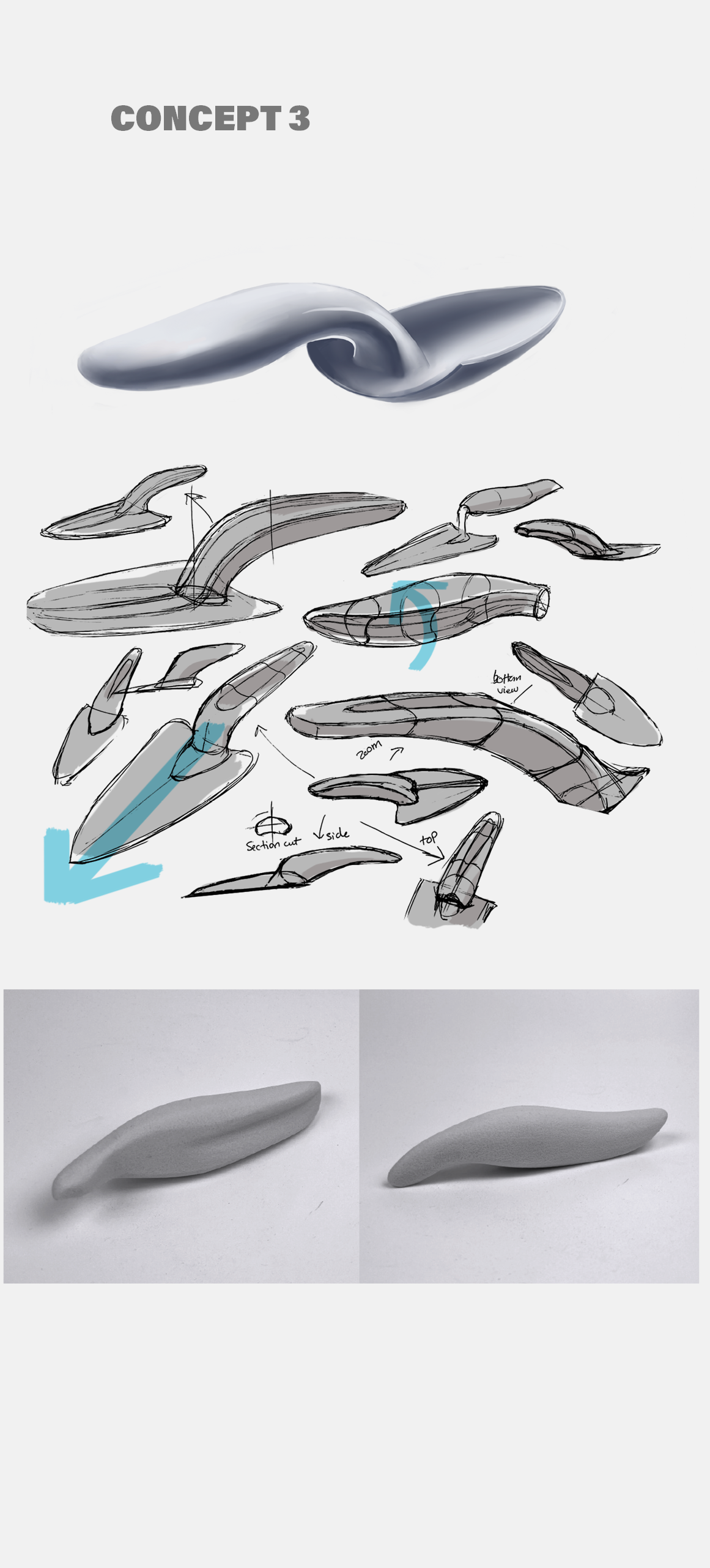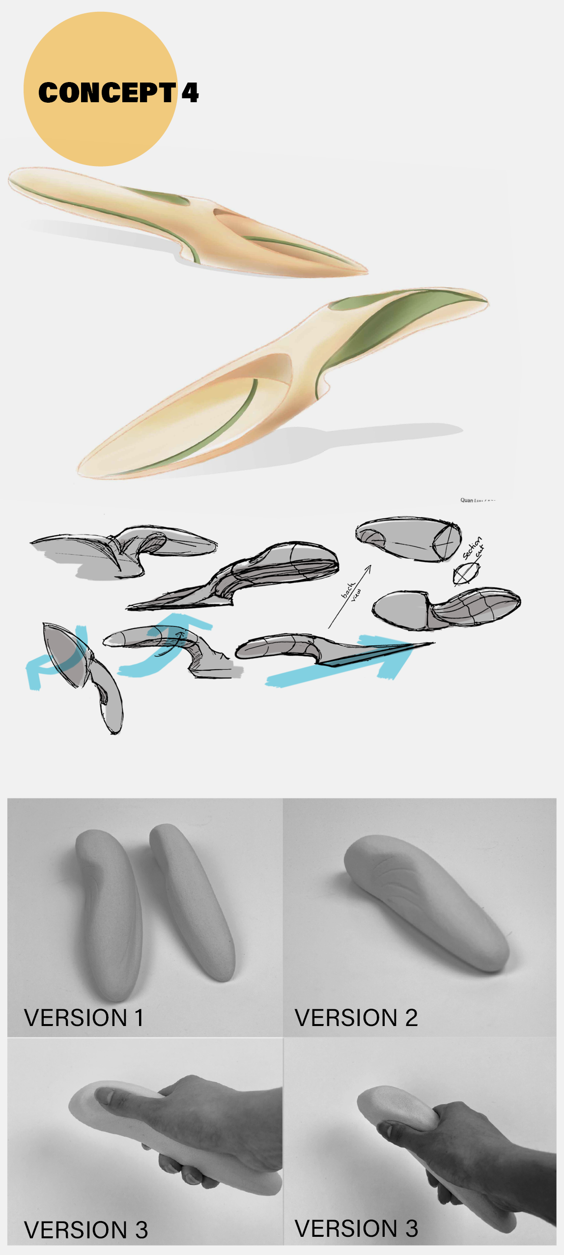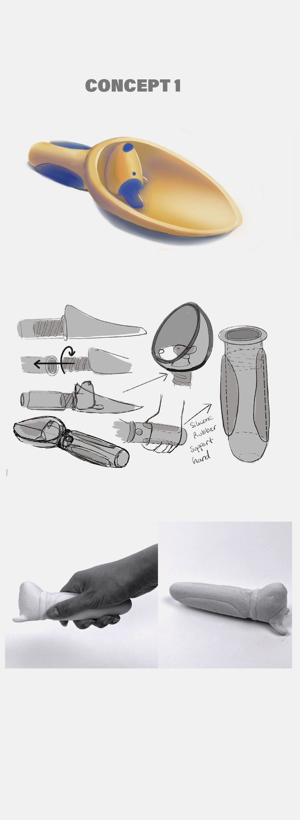 Following the testing phase, concepts 1 and 4 emerged as the most ergonomically sound options. Aligned with my design objective of creating a comfortable and functional handle for adults, I determined that concept 4 offered the greatest potential for further development.