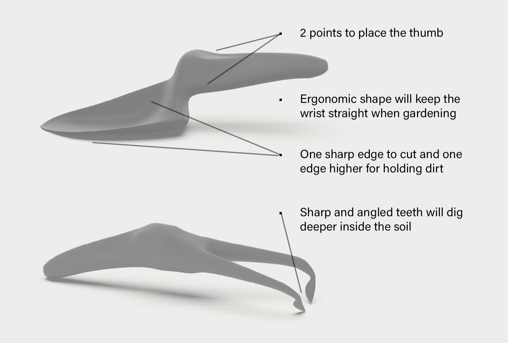 Use the force from your wrist to push hard soil, then bend your wrist back up to pour the soil. Fingers are used to hold tightly on the handle.