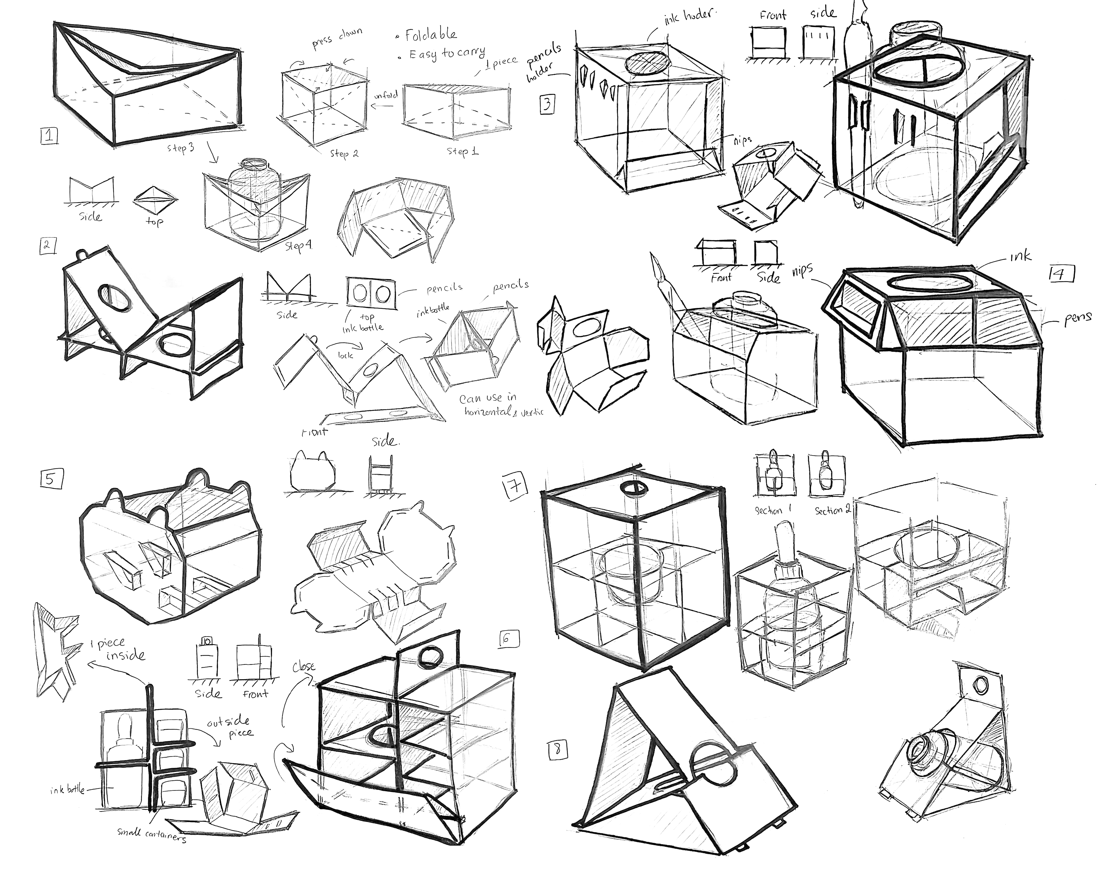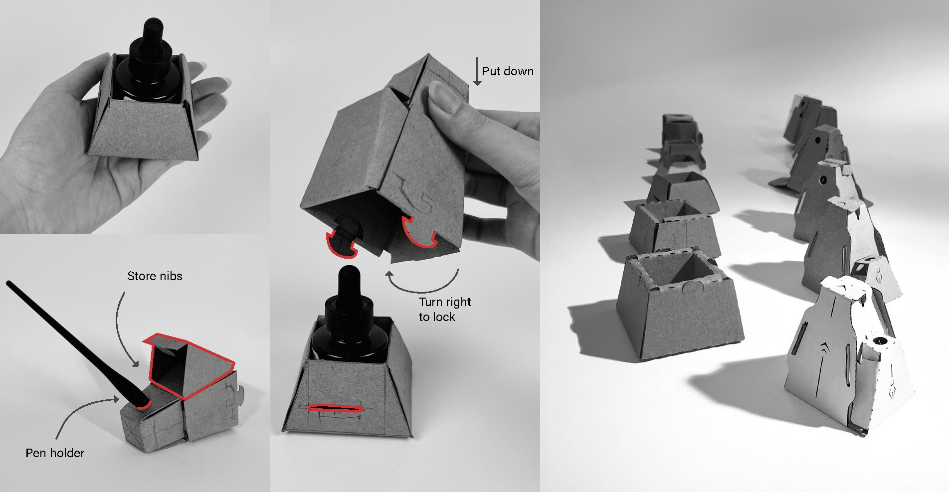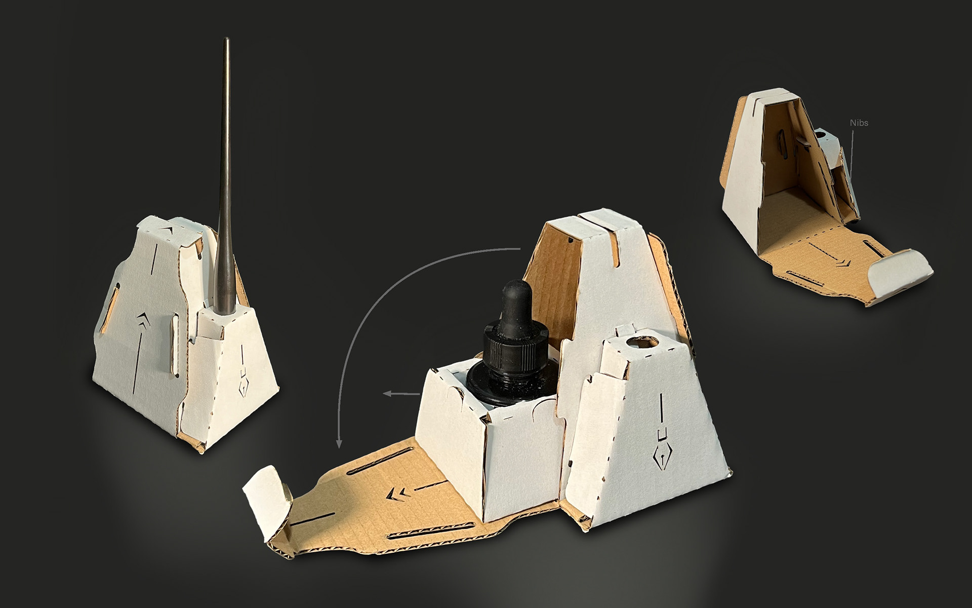 My idea is to design a foldable cardboard product with a big base, a pocket to hold nibs and a pen. Based on user feedback, I chose a small, simple ink holder to refine the design and include space to store a pen and nibs.