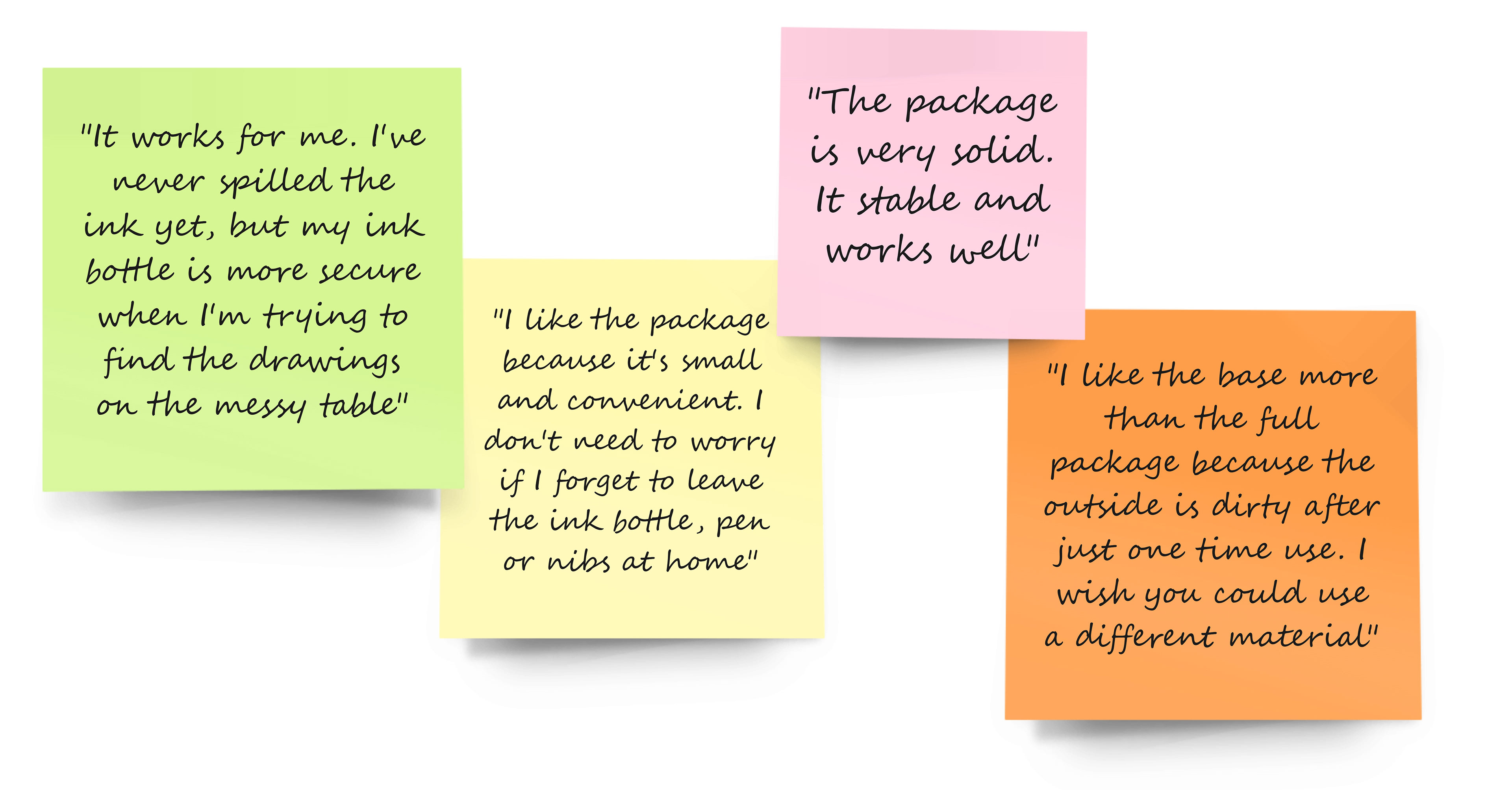 Outcomes: The majority of users reported positive feedback on the ink holder. They noted that the box significantly minimized ink spills and was highly convenient for outdoor sketching.