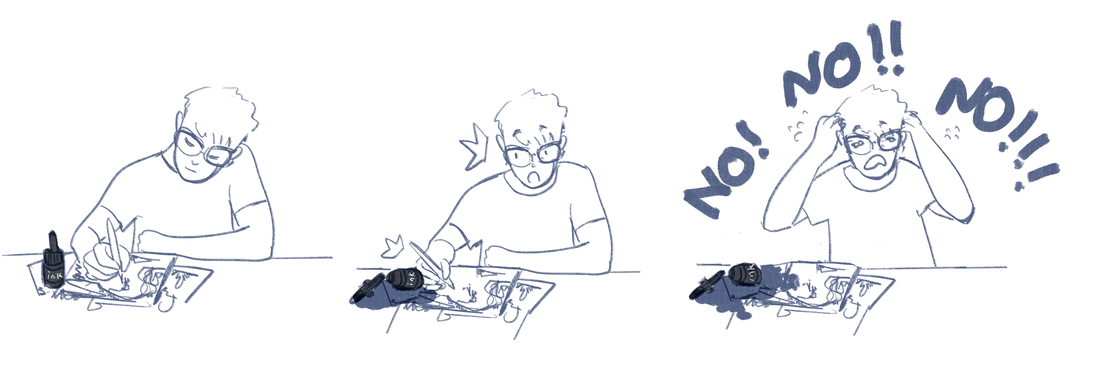 Ink spills are a major frustration for inking artists and animation students, often ruining drawings and necessitating redoing their work.