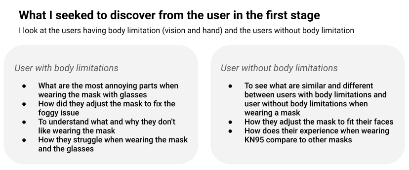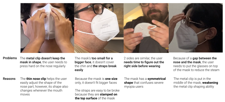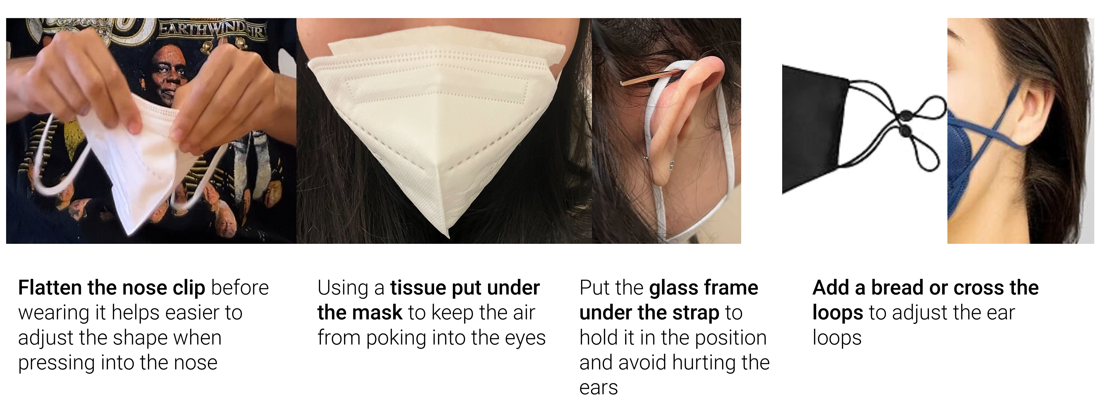 Analyzing user actions and thoughts during interviews, I identified two primary groups experiencing challenges with the KN95 mask: those wearing glasses and those with larger facial structures.